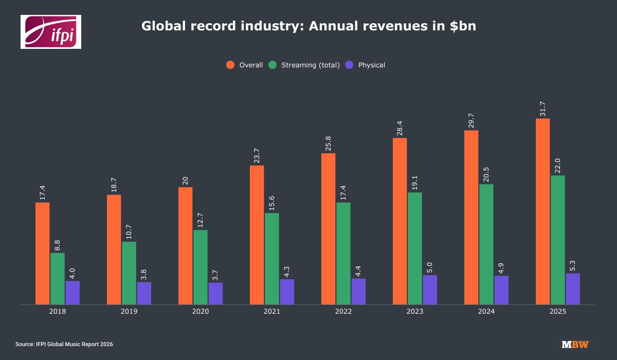 To be clear: the IFPI’s numbers refer strictly to wholesale recorded music revenues (i.e. the money paid through to labels, distributors, and artists).