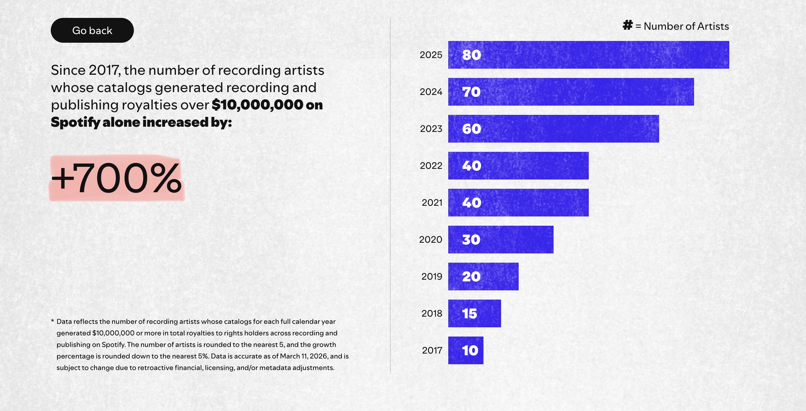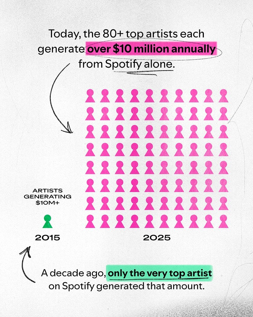 Spotify notes that a decade ago, the very top artist on the platform reached $10 million in annual royalties for the first time. Today, 80 artists each generate more than $10 million annually from the platform alone.