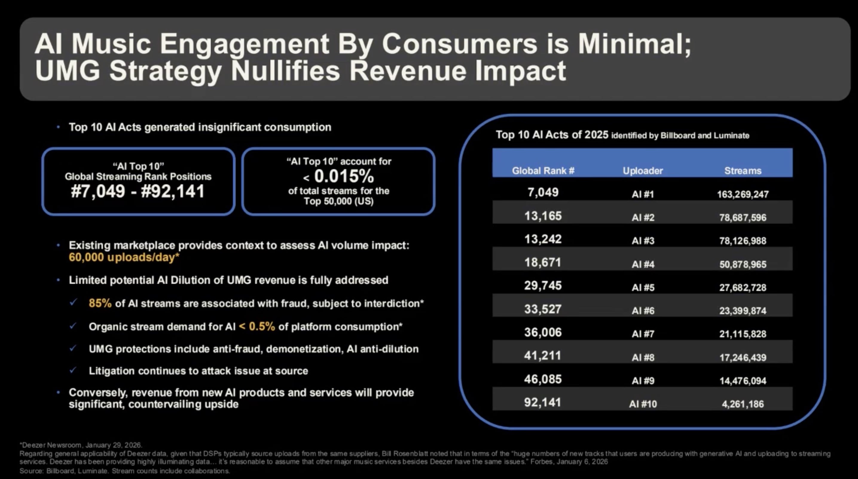 On the call, Michael Nash, Executive Vice President and Chief Digital Officer at UMG, addressed fears about AI revenue dilution, presenting investor presentation data showing that the top 10 AI acts of 2025 — as identified by Billboard and Luminate — ranked between #7,049 and #92,141 globally, accounting for less than 0.015% of total streams for the top 50,000 in the US.