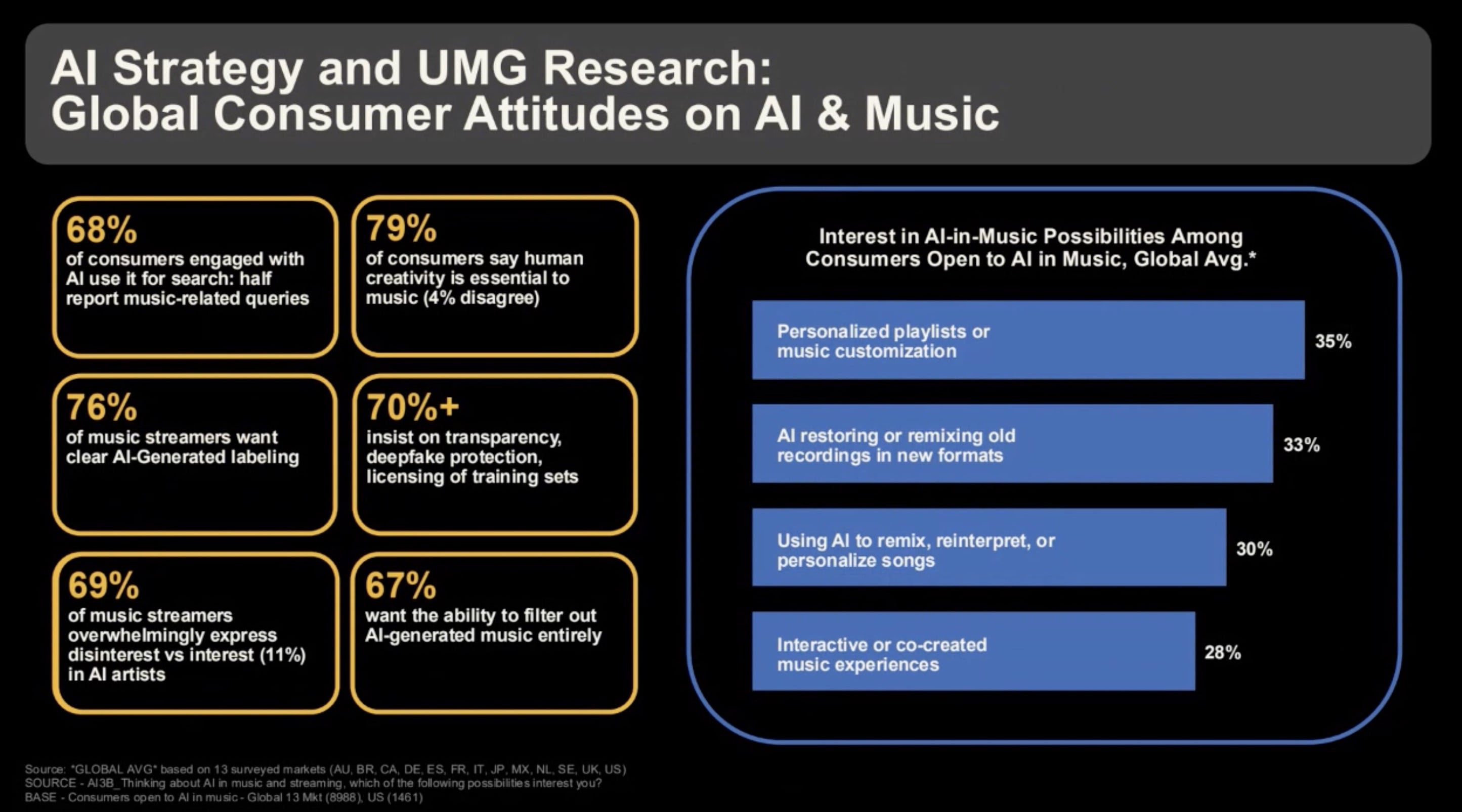 UMG’s own consumer research — a survey of 28,000 people across 13 countries — found that 69% of music streamers express disinterest in AI artists versus just 11% who express interest, that 76% want clear AI-generated labeling, and that 67% want the ability to filter out AI-generated music entirely.