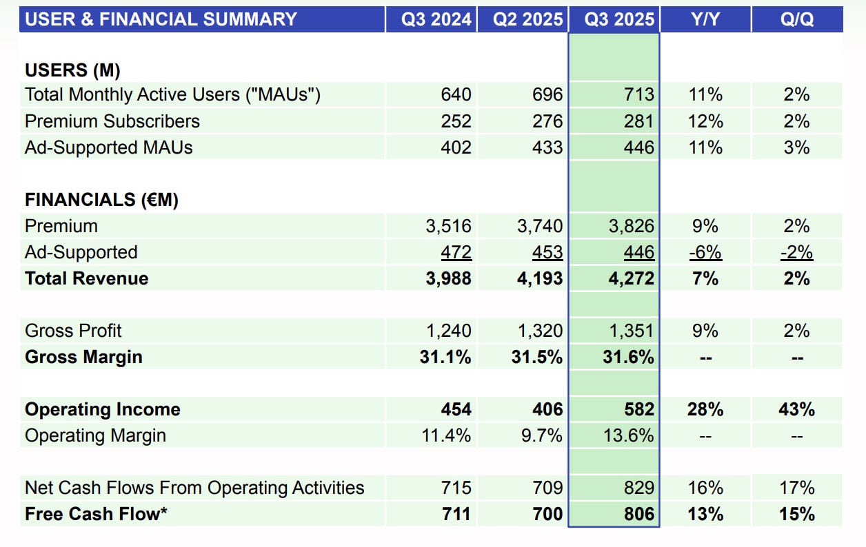 Spotify generated EUR €4.272 billion (USD $4.99bn) in total quarterly revenue in Q3 (including Premium and ad-supported), up 12% YoY at constant currency.