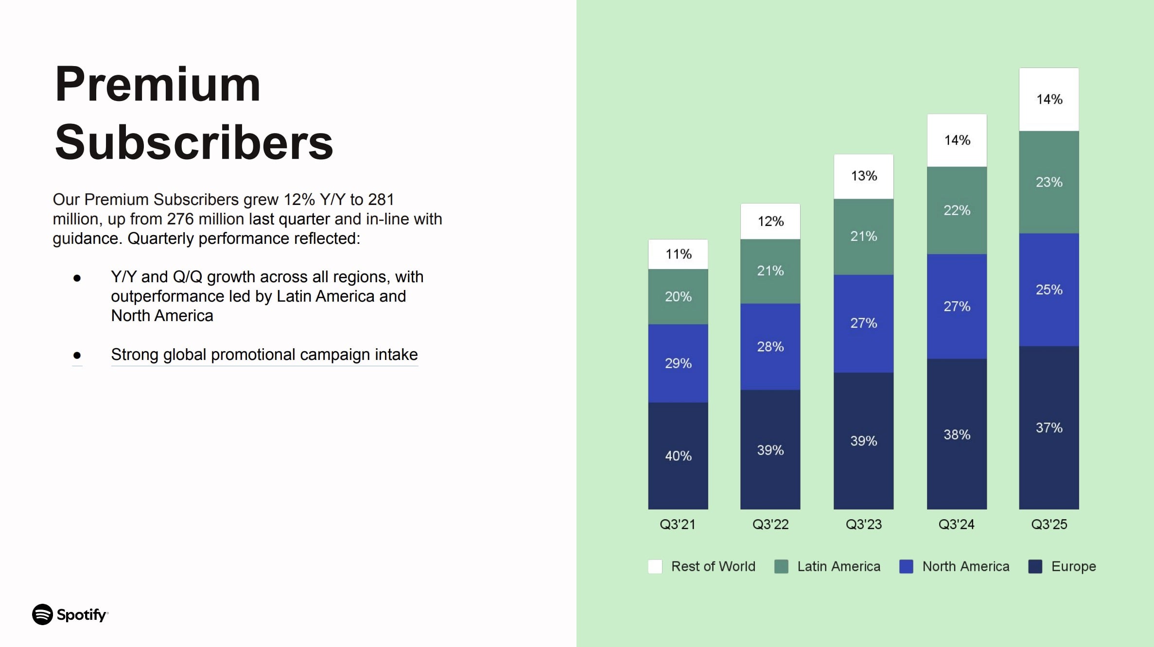 Spotify reported that this Premium Subscriber performance was fuelled by “Y/Y and Q/Q growth across all regions, with outperformance led by Latin America and North America” as well as “Strong global promotional campaign intake”.
