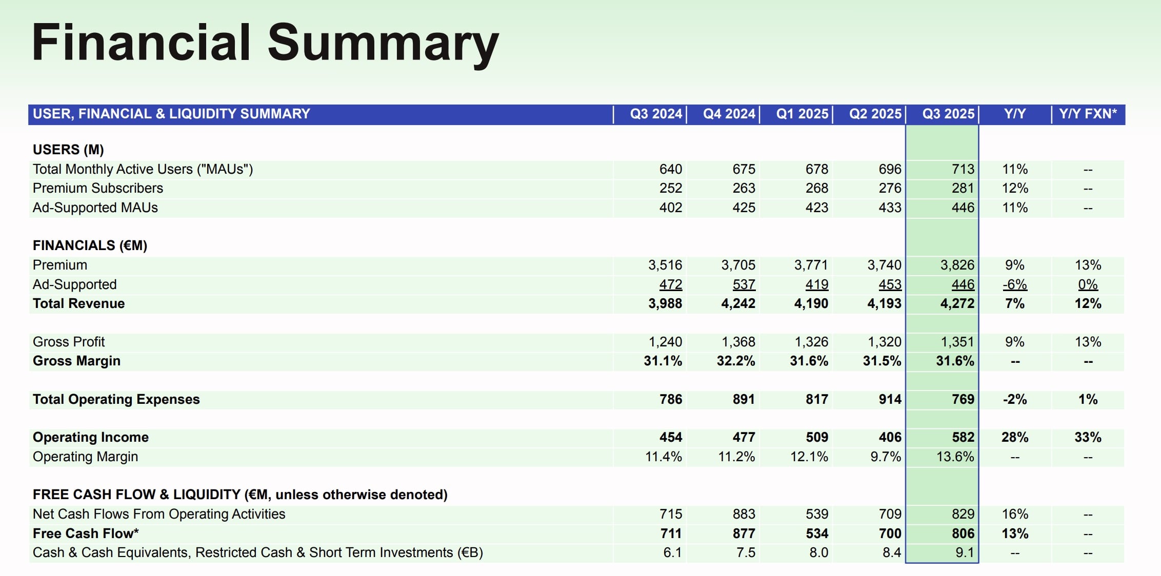 That was up +17 million MAUs from the 696 million reported for the prior quarter (Q2 2025), and above guidance by 3 million (Spotify forecast that it would reach 710 million MAUs in Q3).