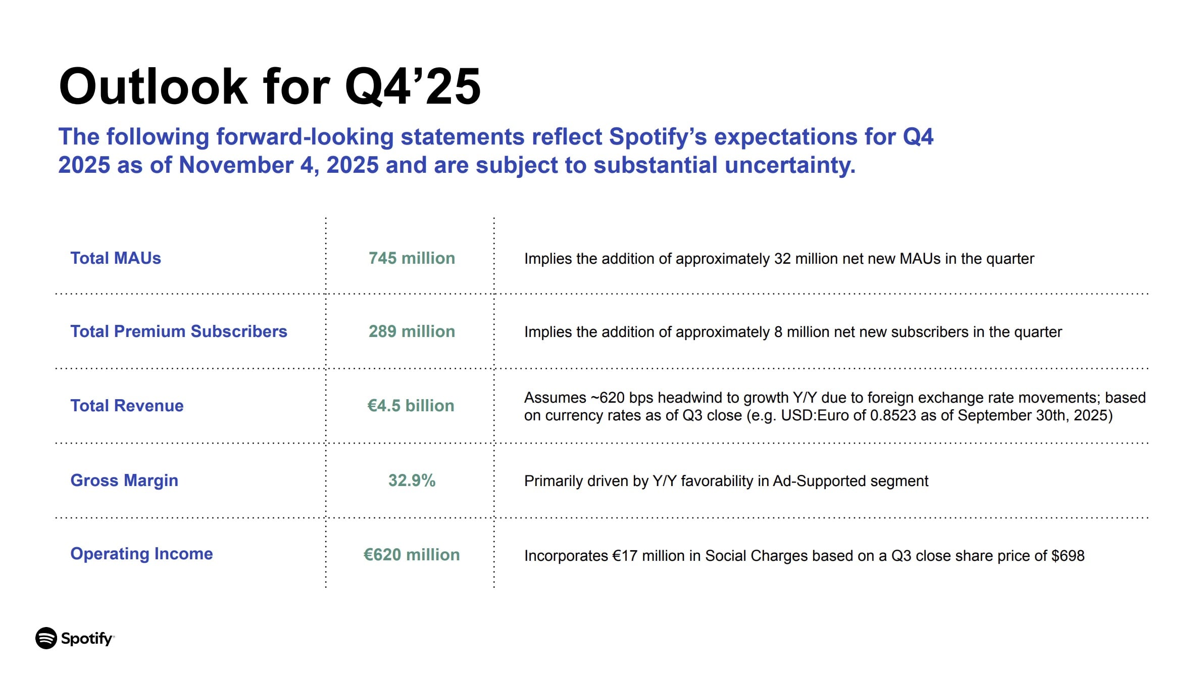 In terms of guidance for Q4, Spotify forecasts reaching 745 million MAUs at the close of December, an addition of around 32 million net new MAUs in the quarter.