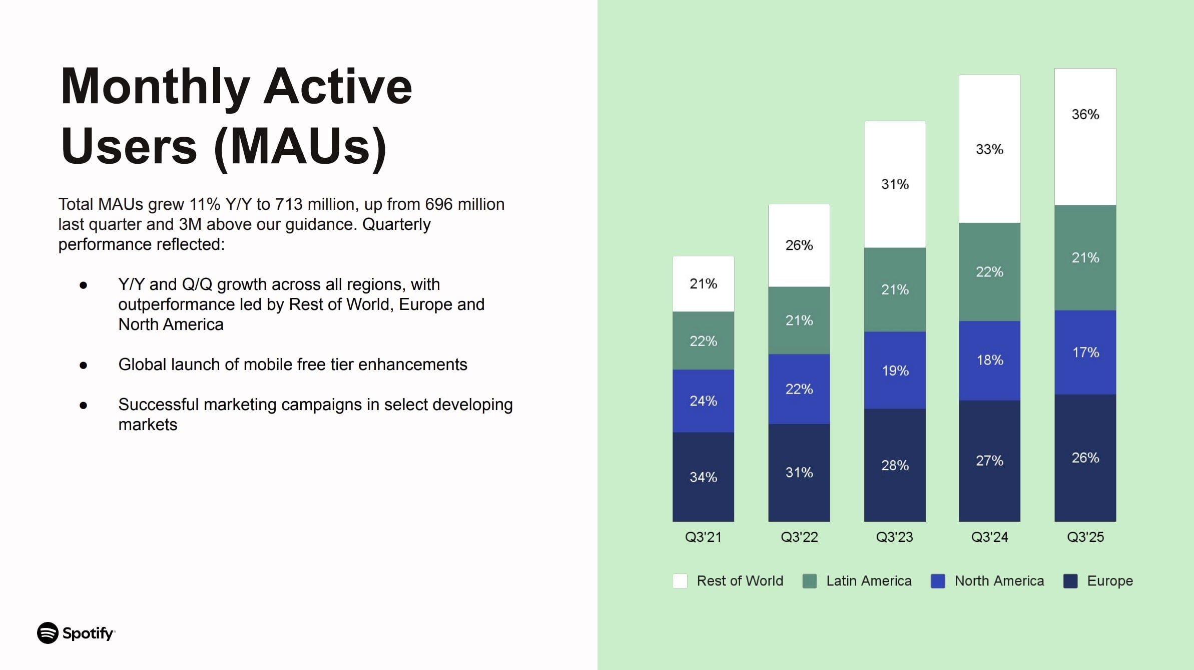 Spotify said MAU performance in Q3 reflected: “Y/Y and Q/Q growth across all regions, with outperformance led by Rest of World, Europe and North America, ” plus the “Global launch of mobile free tier enhancements” and “successful marketing campaigns in select developing markets”.
