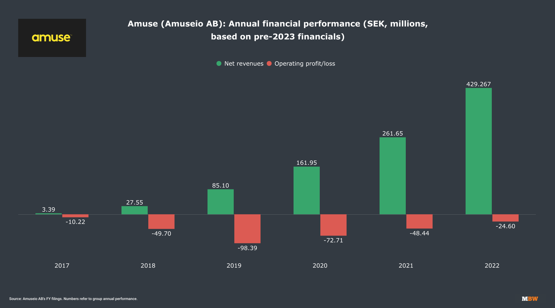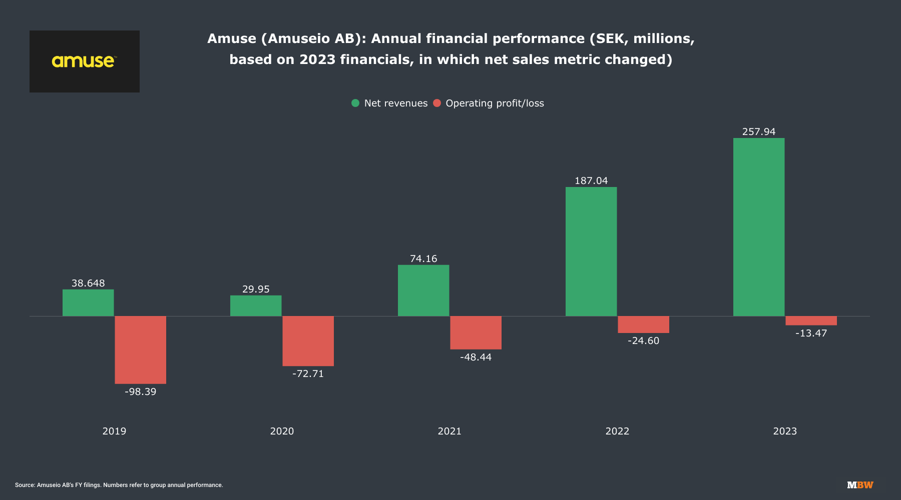 In its FY 2023 annual report, Amuse changed the reporting metric of its net sales, affecting all previous years. (This move did not affect previously-reported annual margin figures, including operating profit/loss.)