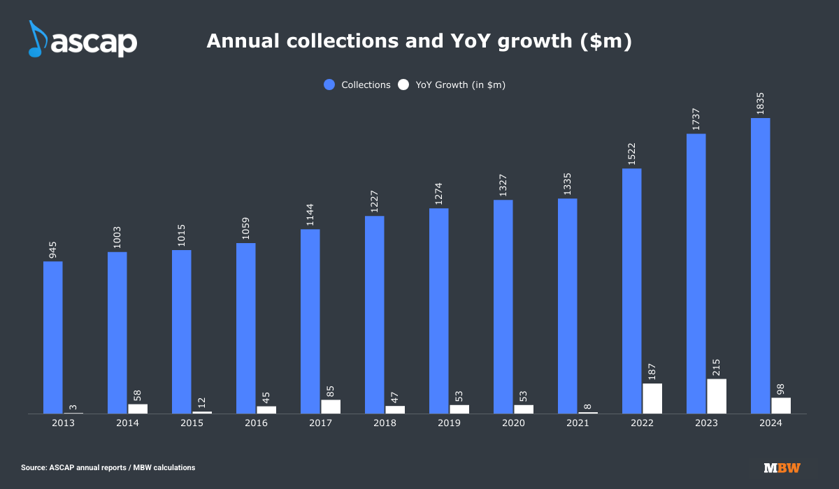 US-based collection and licensing society ASCAP annually confirms its yearly total collections and its annual payouts to members.