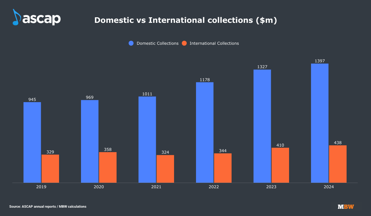 Within the PRO’s annual reports, it confirms how much of its annual collections and member payouts have been generated domestically (in the US) and internationally (outside the US).