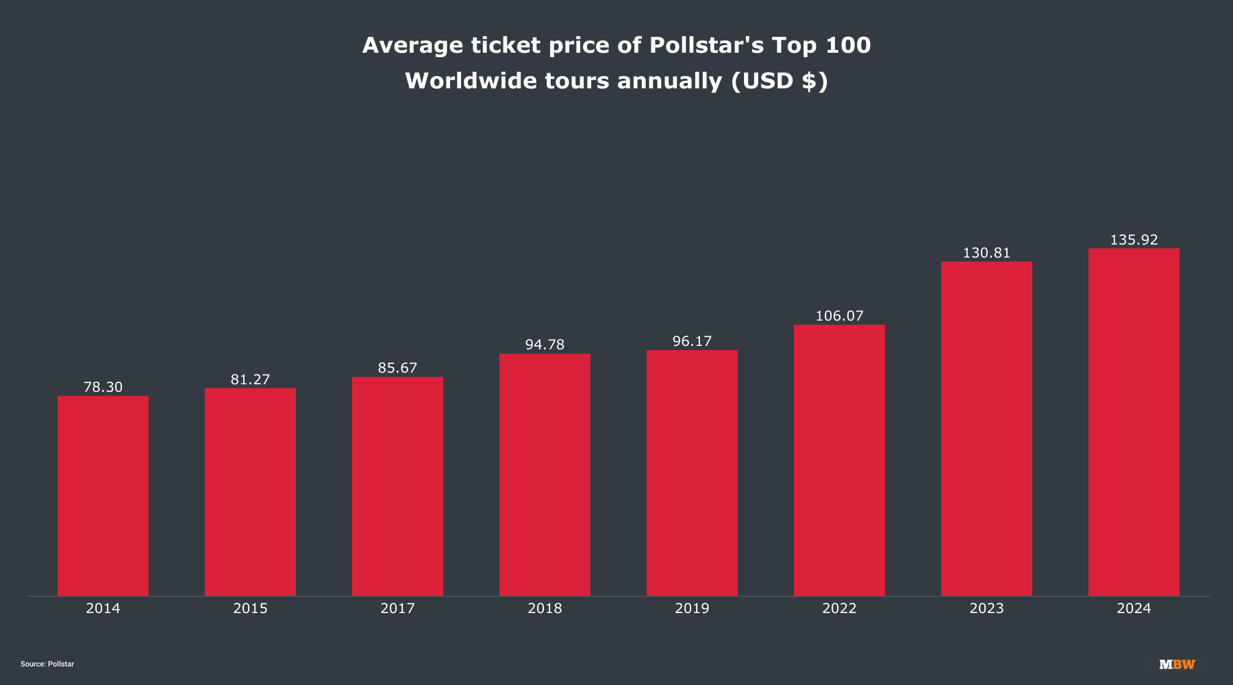 Within this data, Pollstar lists the Top 100 Worldwide tours by total revenue from the year. And from this data, Pollstar calculates the average ticket price to these shows (which, by their nature, will be at the blockbuster-end of the live circuit).