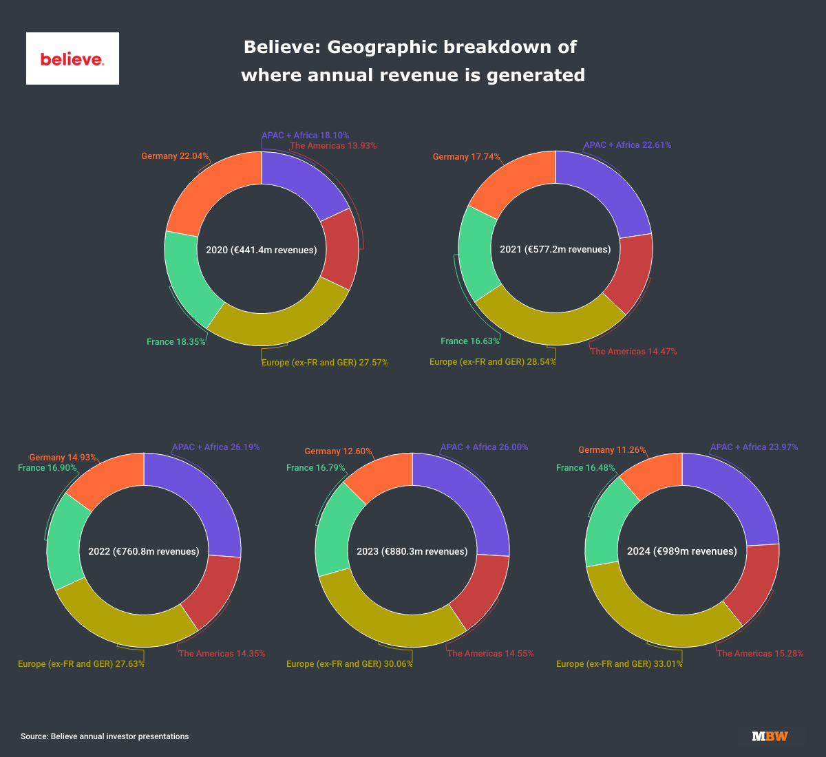 Each year, France-headquartered music company Believe issues investor presentations that break down where in the world the company has generated its annual revenues.