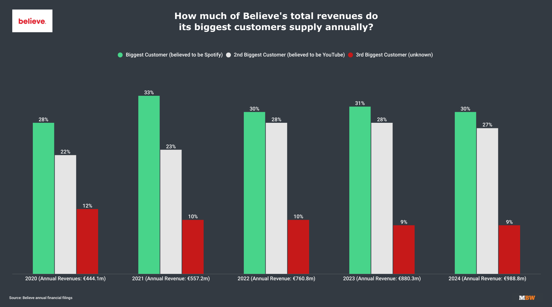 Within these financials, Believe reveals the percentage of its total revenues provided by its three biggest customers each year.