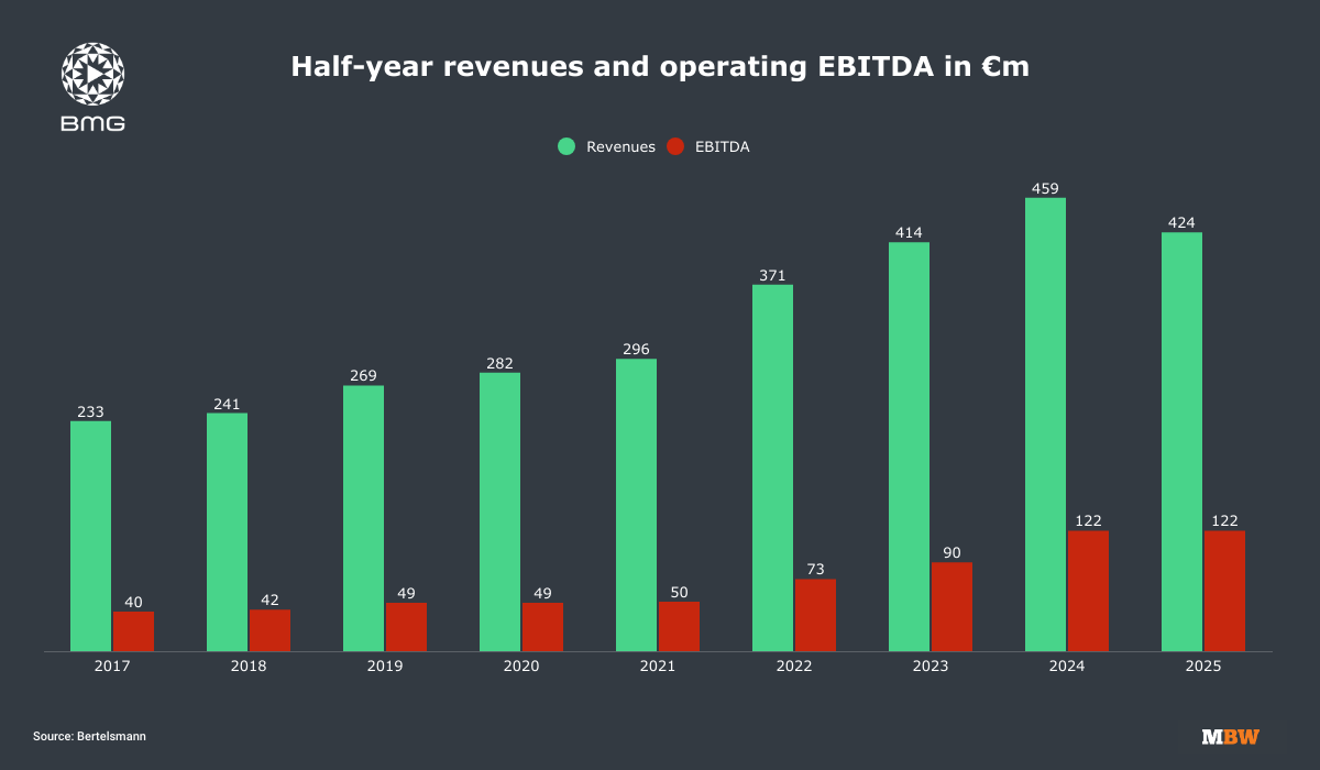 The half-year revenues of BMG, up to June 30 (inclusive) each year, are announced by parent company Bertelsmann in calendar H2 annually.