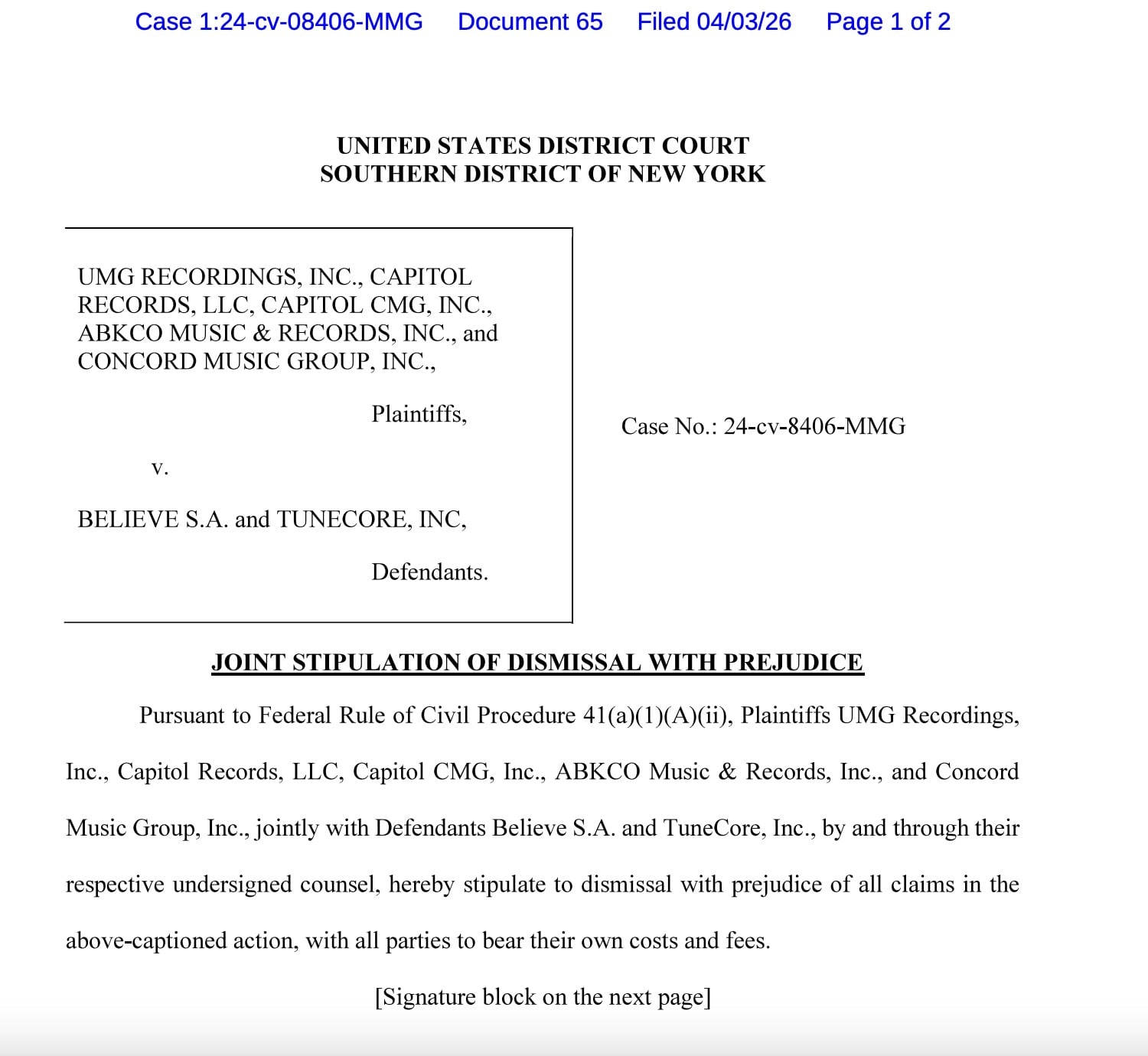 A Joint Stipulation of Dismissal With Prejudice was filed today (April 3) in the US District Court for the Southern District of New York, confirming that all claims in the case have been dismissed.