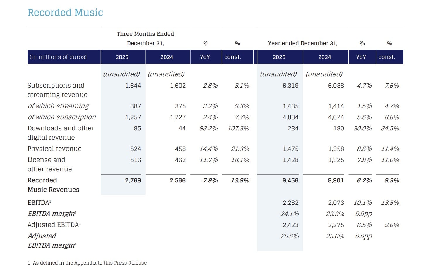 Universal’s overall Recorded Music revenue for the fourth quarter of 2025 was €2.769 billion ($3.22bn), up13.9% YoY at constant currency.