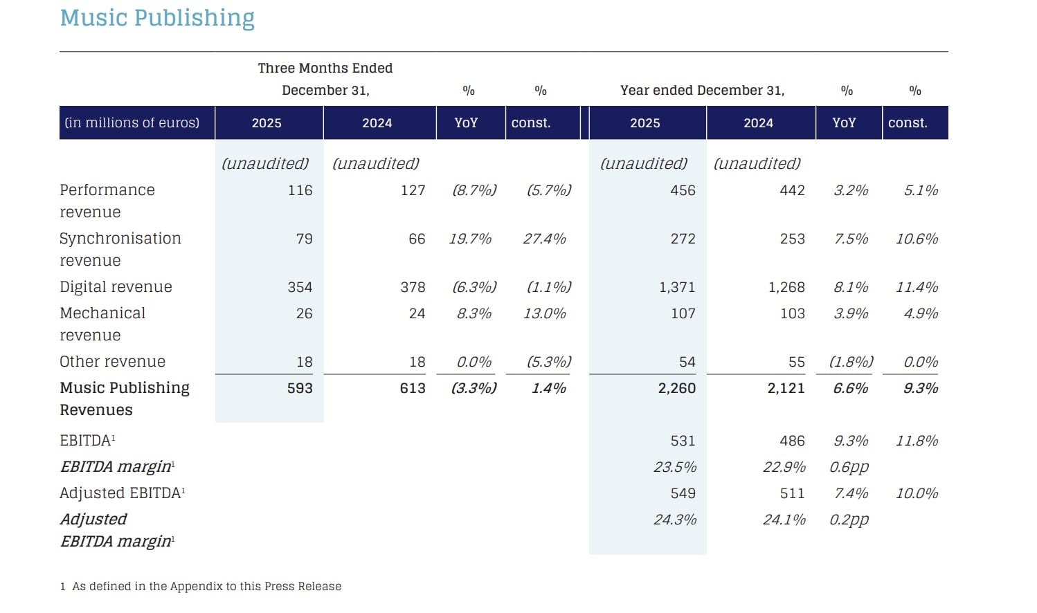 Universal’s overall Music Publishing revenue for the fourth quarter of 2025 was €593 million ($689.5m), up 1.4% YoYat constant currency.