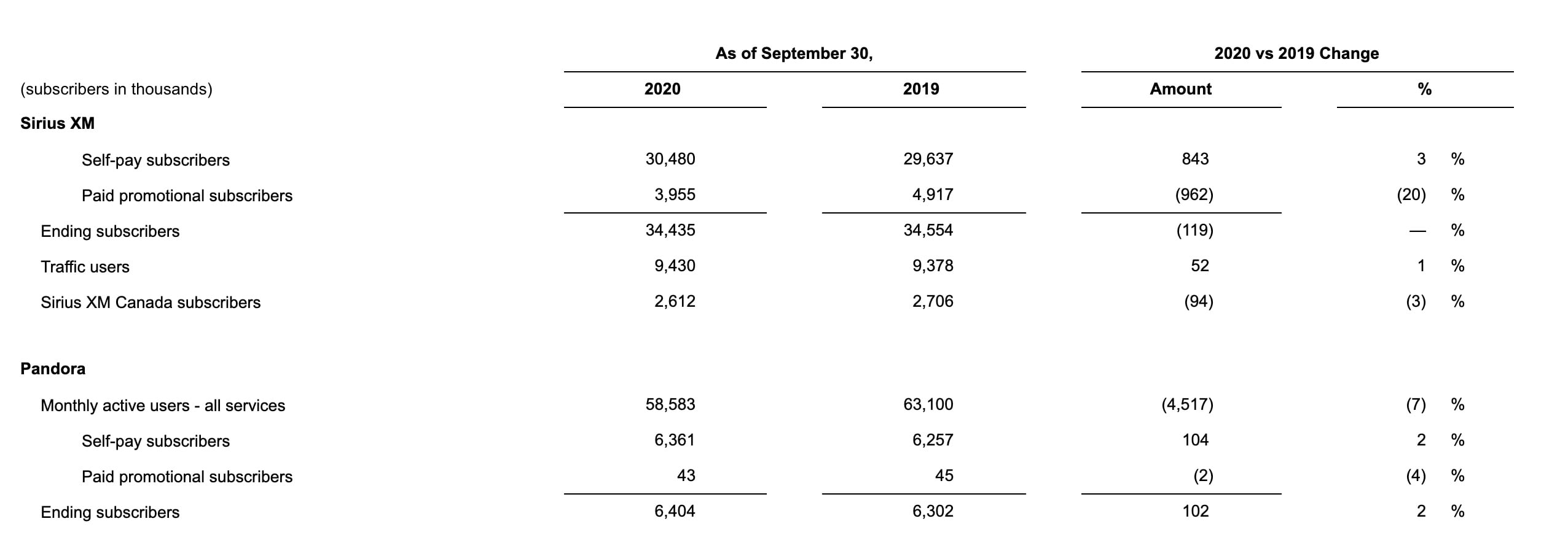 SiriusXM reported to have 30.48 million self pay subscribers as of September 30 2020, up 3% year-over-year, while subsidiary Pandora was reported to have had 58.58m Monthly Active Users as of September 30, 2020 a 7% decline year-over-year.