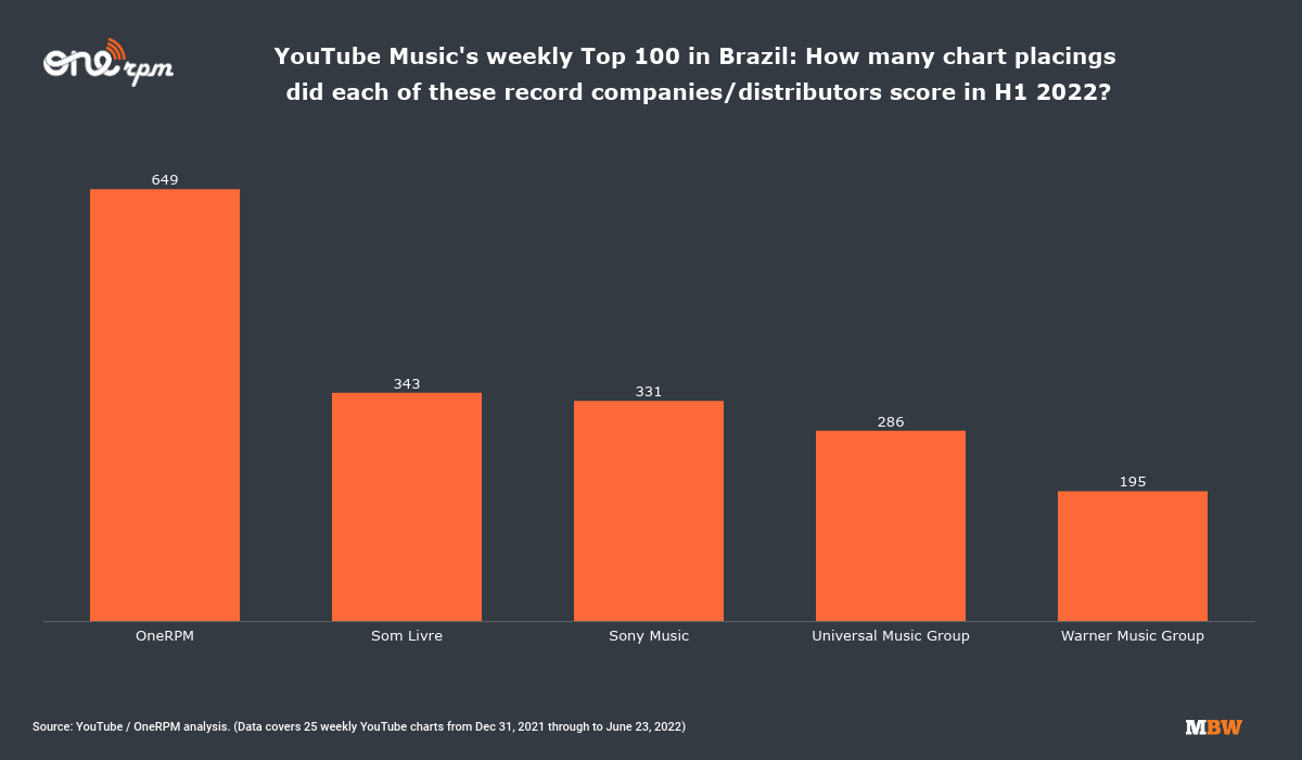 ONErpm’s success in Brazil certainly isn’t limited to Spotify: On YouTube, for example, it beat the likes of Universal Music and Warner Music in the first half of 2022 in terms of the number of distributed artists taking places on the platform’s weekly Top 100 (see below).