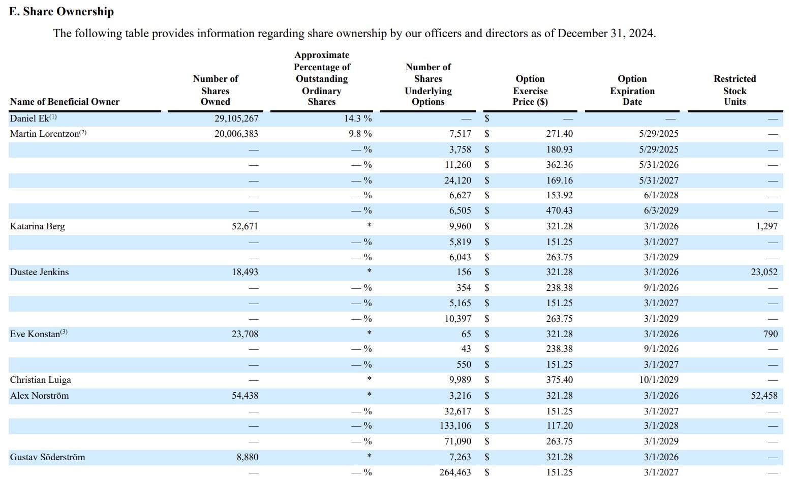 According to Spotify’s annual investor report, Daniel Ek owned 14.3% of Spotify’s ordinary shares on December 31, 2024 (see below).