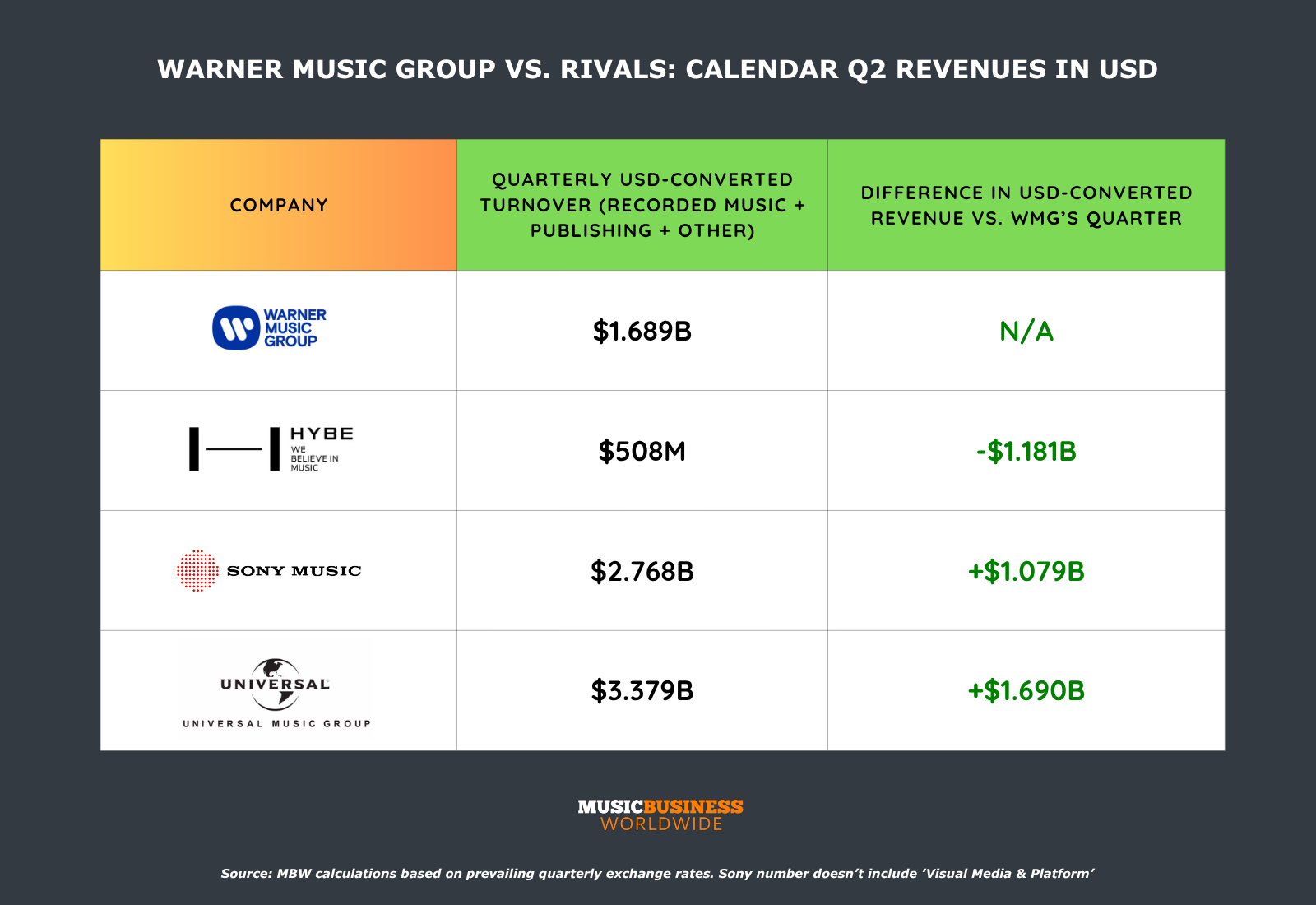 Case in point: In calendar Q2, Warner Music Group’s company-wide turnover (USD $1.69B) was almost exactly half the size of Universal Music Group’s turnover in the same period (USD $3.38B).