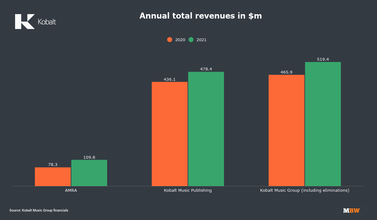 According to documents filed at Companies House in the UK, Kobalt Music Group’s total revenues (not including asset management fees) in FY2021 (the 12 months to end of June 2021) stood at $519.4 million.