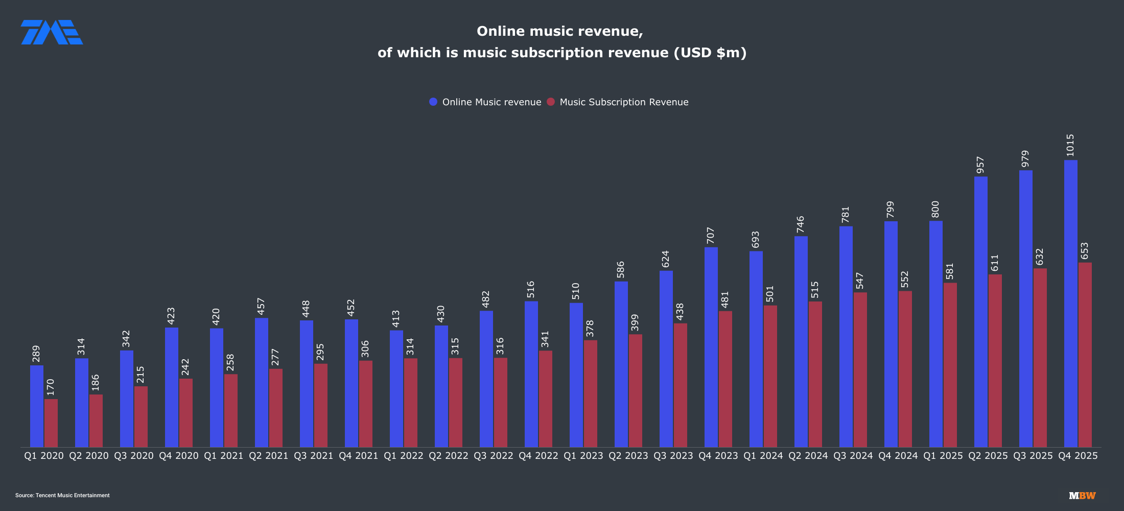 For the full year, music subscription revenue hit RMB 17.66 billion (USD $2.53 billion), up 16.0% YoY from RMB 15.23 billion in 2024.