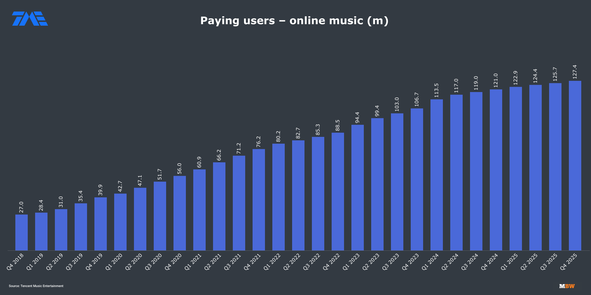 TME’s total music monthly active users (MAUs) actually fell 5.0% YoY to 528 million in Q4 – a continuation of a long-running decline from a peak of over 650 million.