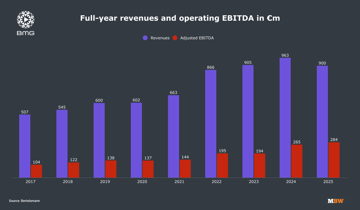 BMG’s annual adjusted operating EBITDA reached an all-time high of EUR €284 million ($321m), up 7.2% YoY compared to the prior year’s record equivalent of €265 million.