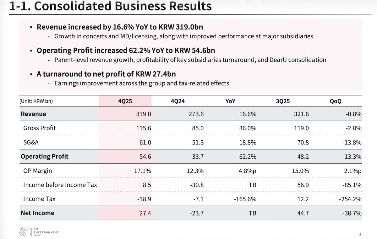 SM’s fourth-quarter performance was primarily driven by expanded global touring activities from the company’s core IP, including acts such as NCT DREAM, aespa, RIIZE, and NCT WISH, alongside continued growth in its artist-driven merch and licensing businesses.